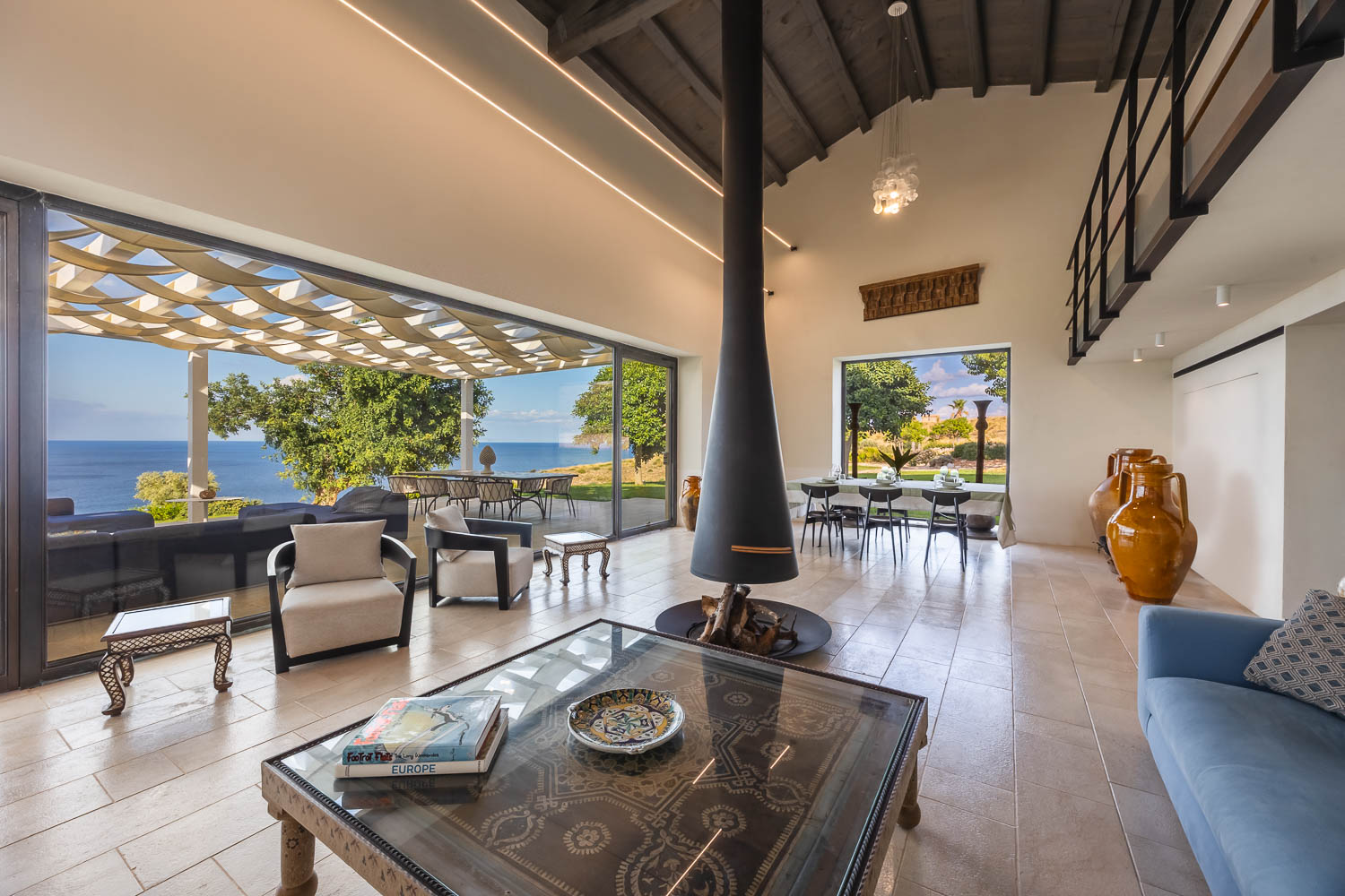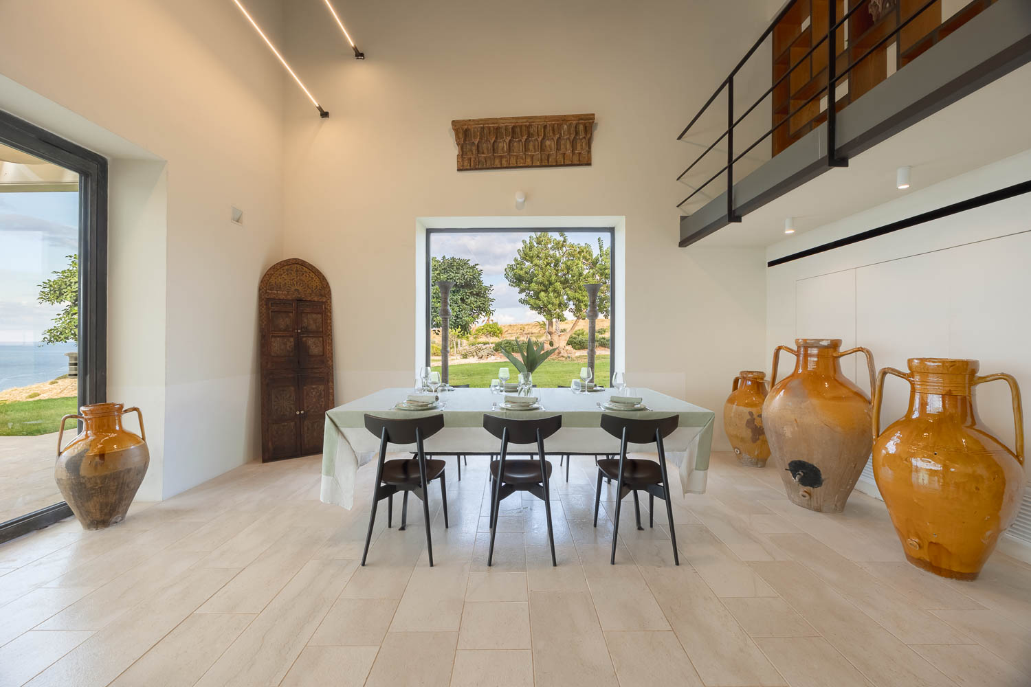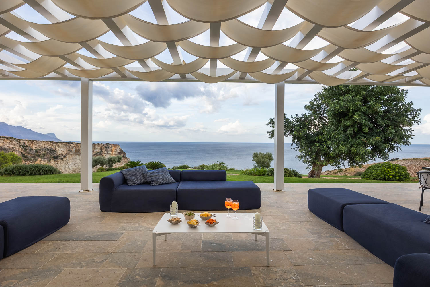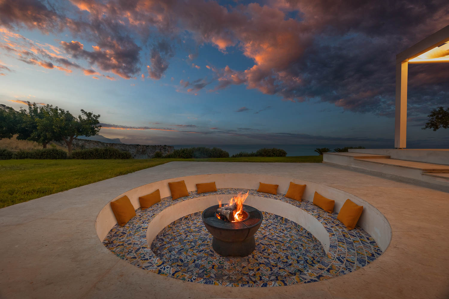 All’esterno, la vita si svolge tra il patio fronte mare, la piscina circolare a sfioro e un suggestivo conversation pit con braciere, perfetto per cene sotto le stelle o aperitivi al tramonto. Dal giardino, un sentiero privato conduce direttamente alla Fossa dello Stinco, una spettacolare discesa a mare scavata nella roccia, tra le più affascinanti della costa siciliana.