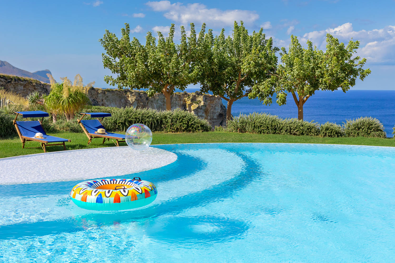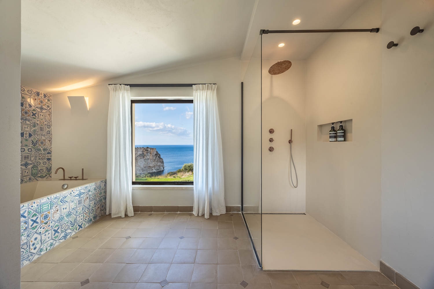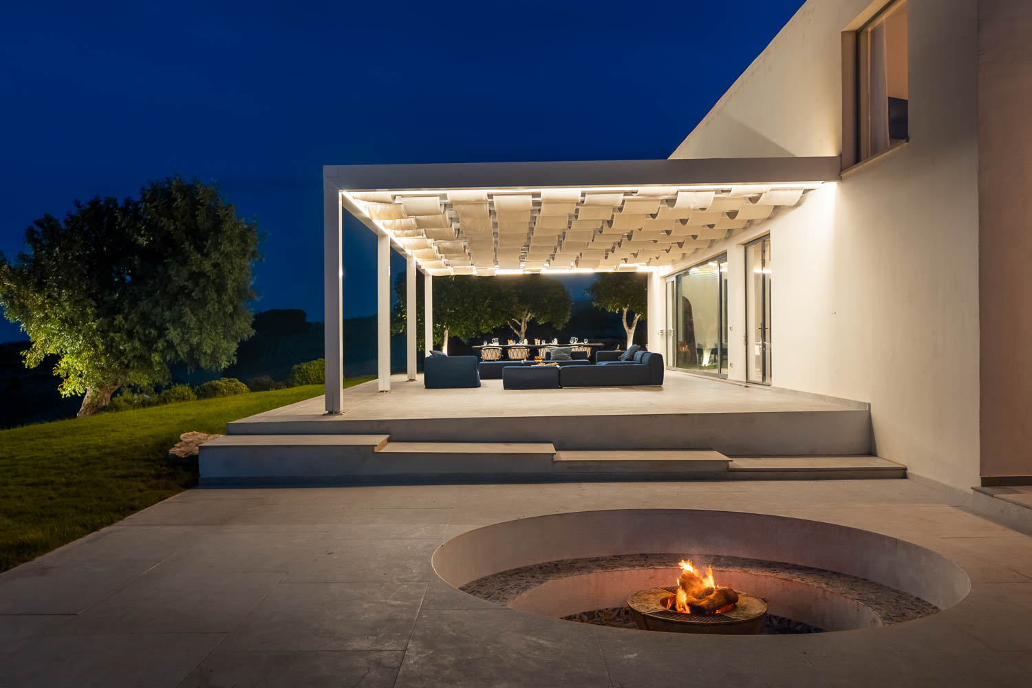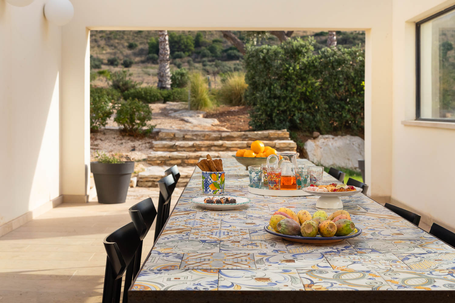 All’esterno, la vita si svolge tra il patio fronte mare, la piscina circolare a sfioro e un suggestivo conversation pit con braciere, perfetto per cene sotto le stelle o aperitivi al tramonto. Dal giardino, un sentiero privato conduce direttamente alla Fossa dello Stinco, una spettacolare discesa a mare scavata nella roccia, tra le più affascinanti della costa siciliana.