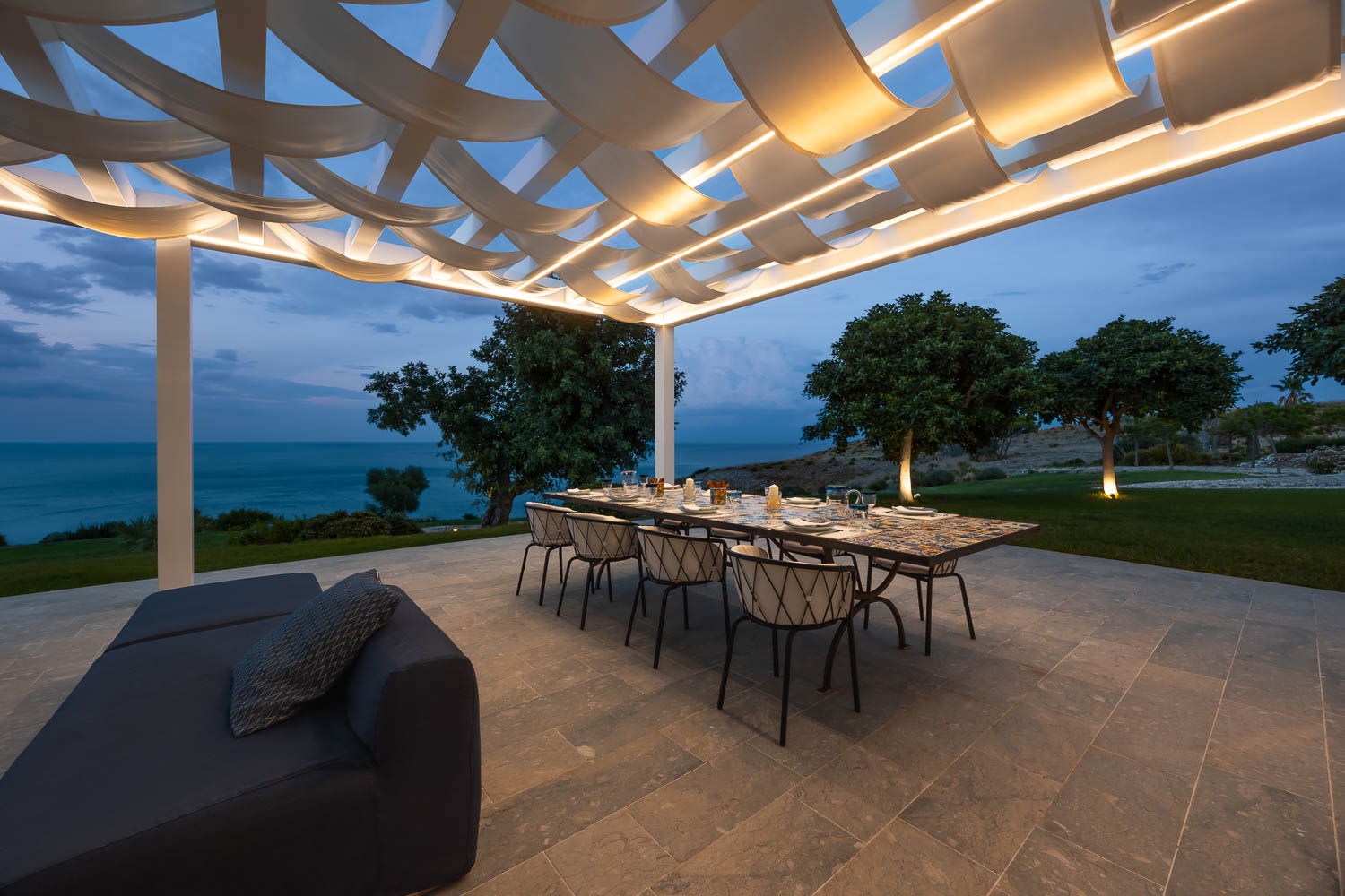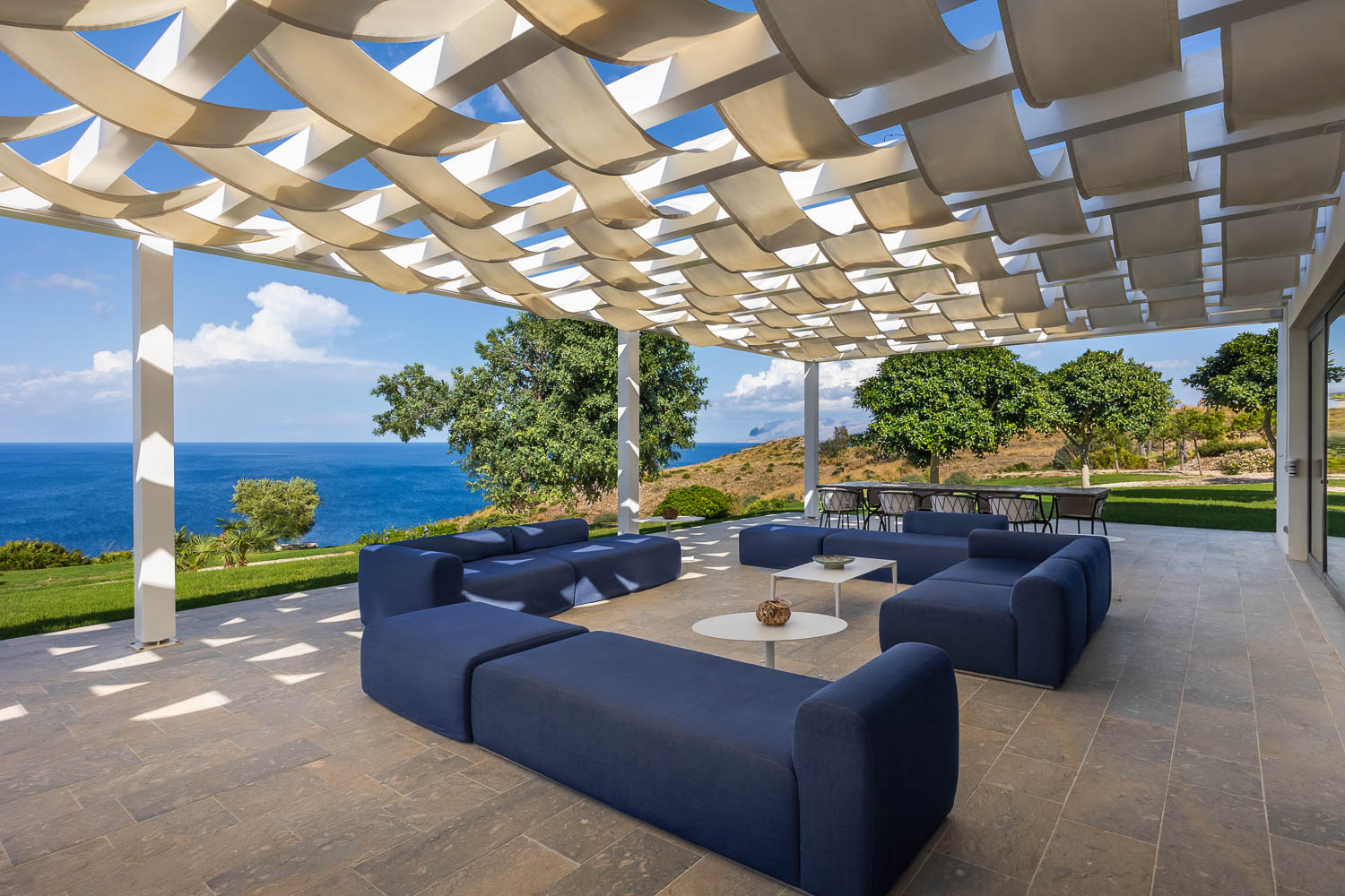 Terrazza fronte mare con zona lounge e pompeiana ombreggiante