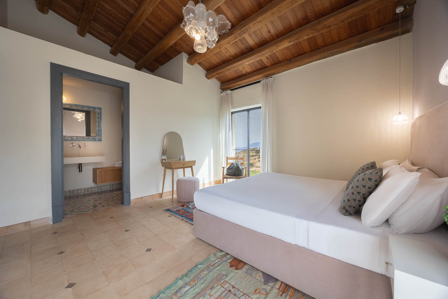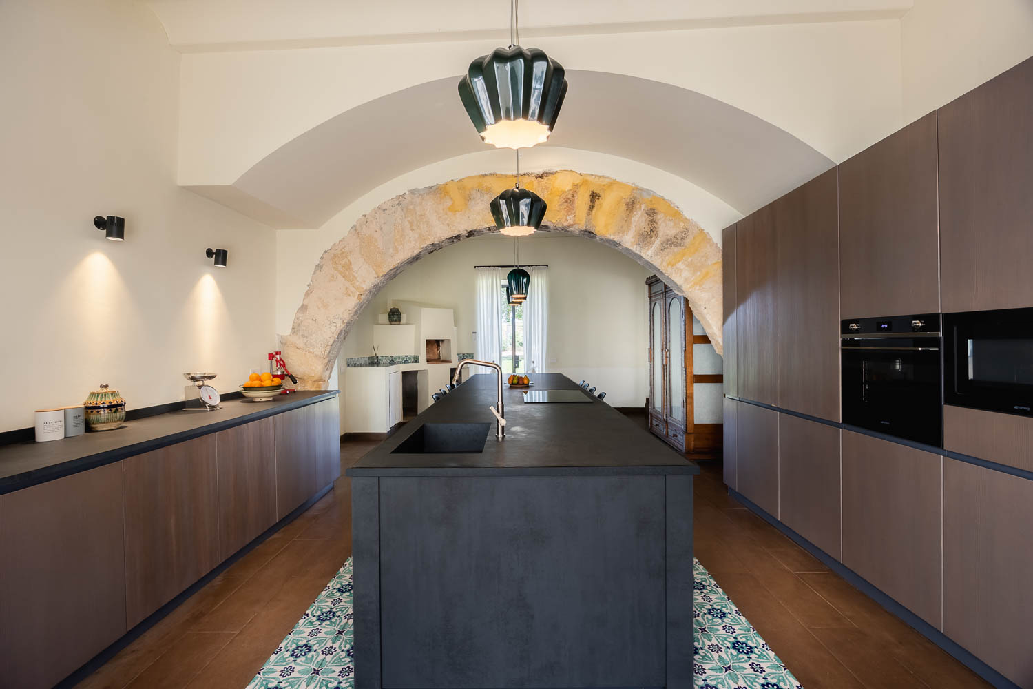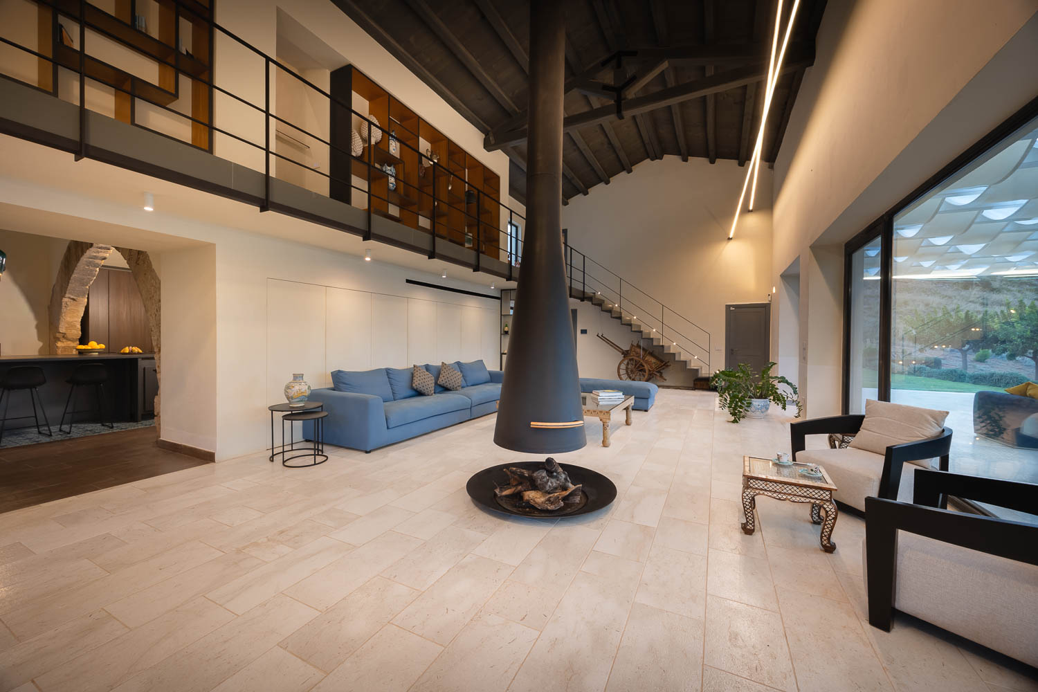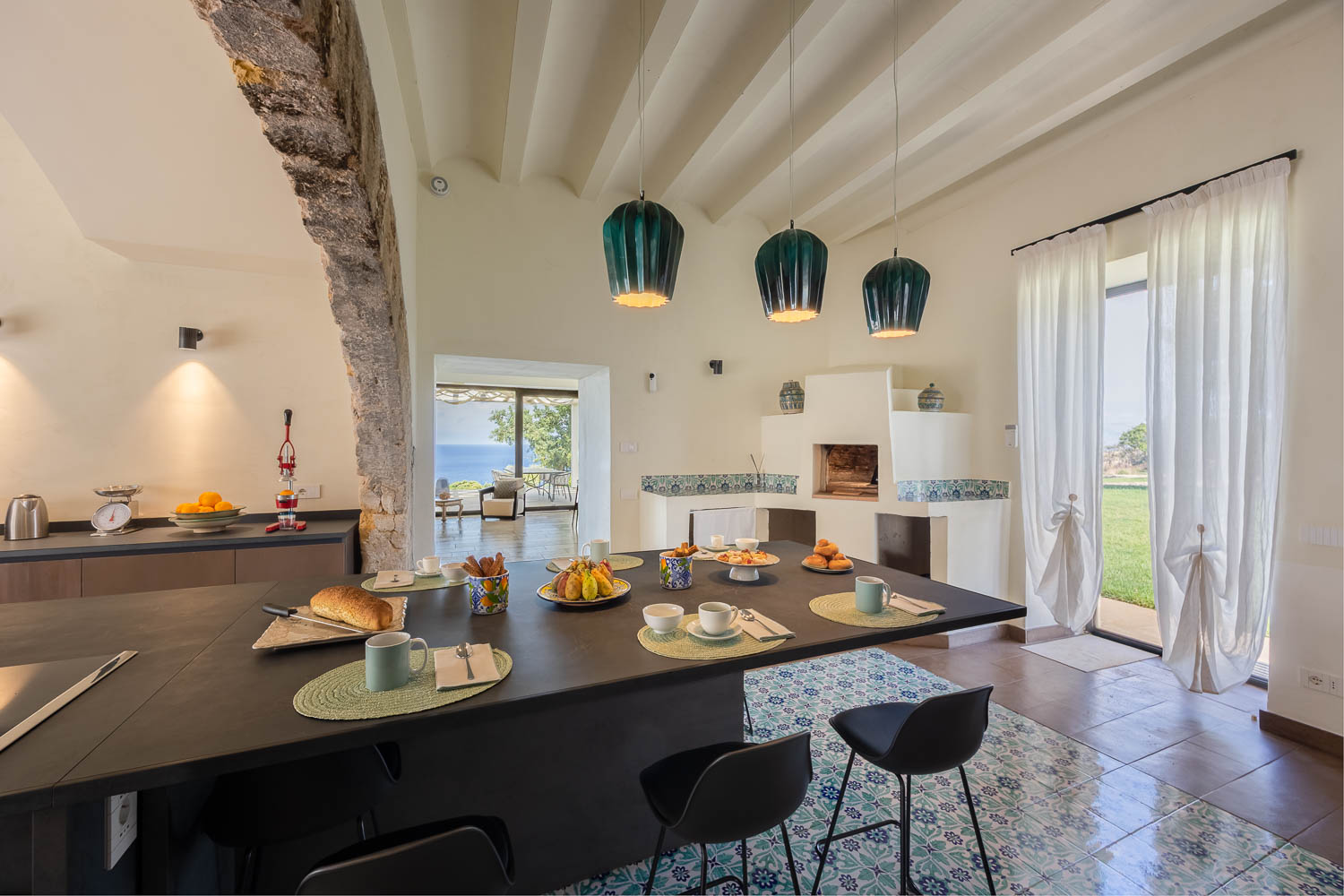 Il design degli interni dialoga con l’esterno attraverso grandi vetrate panoramiche e porticati ombreggiati, mentre la cucina, ampia e accogliente, è dotata di isola centrale e forno a legna tradizionale per momenti di convivialità intimi e informali. Le camere da letto si distribuiscono tra i vari livelli garantendo privacy e indipendenza, con suite panoramiche, bagni en-suite, cabina armadio e accessi riservati che rendono la villa adatta anche a soggiorni più lunghi e riservati.