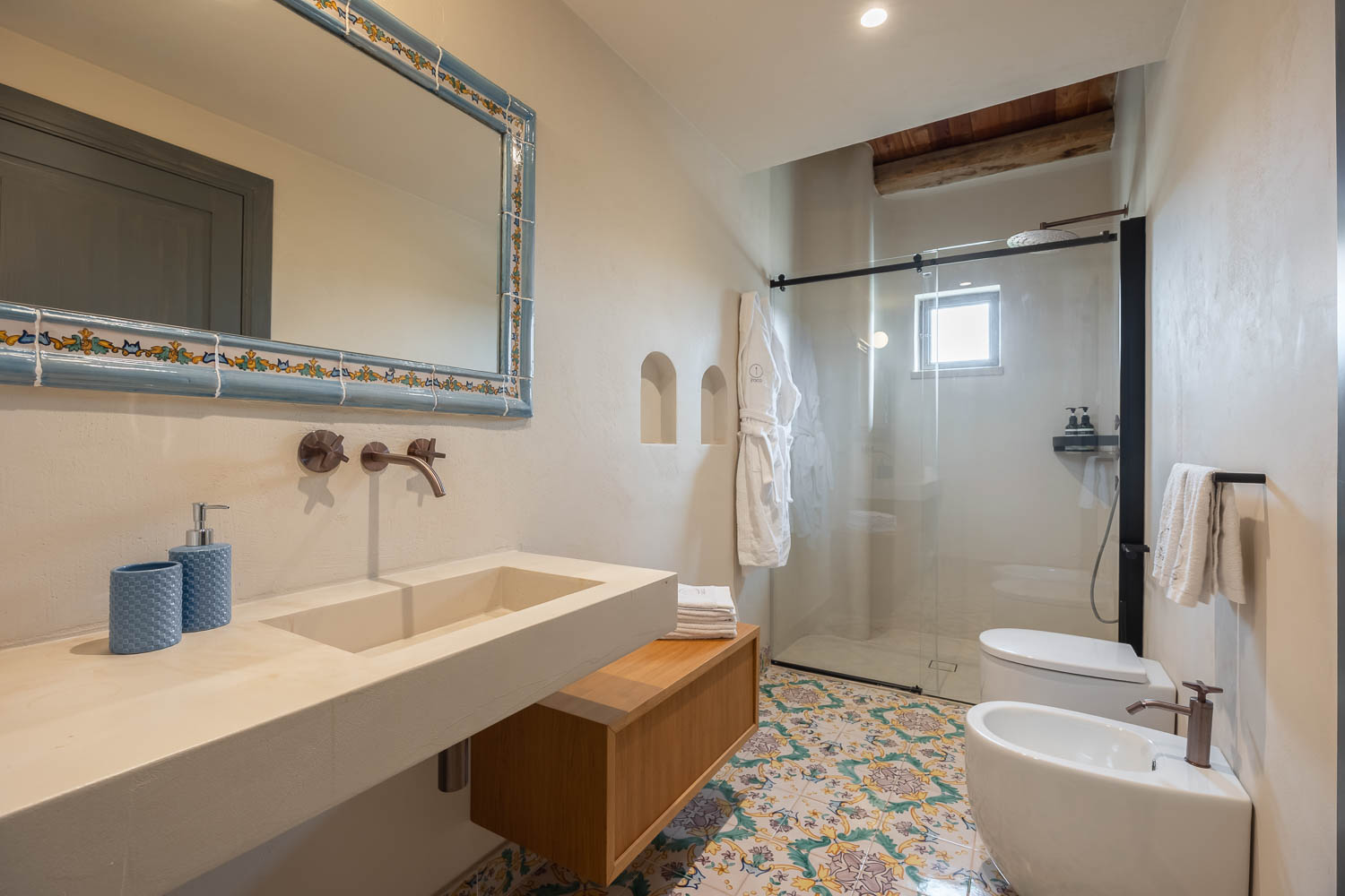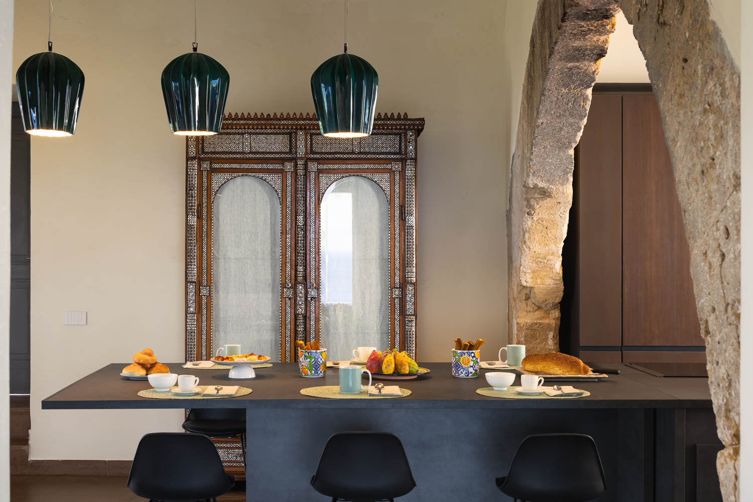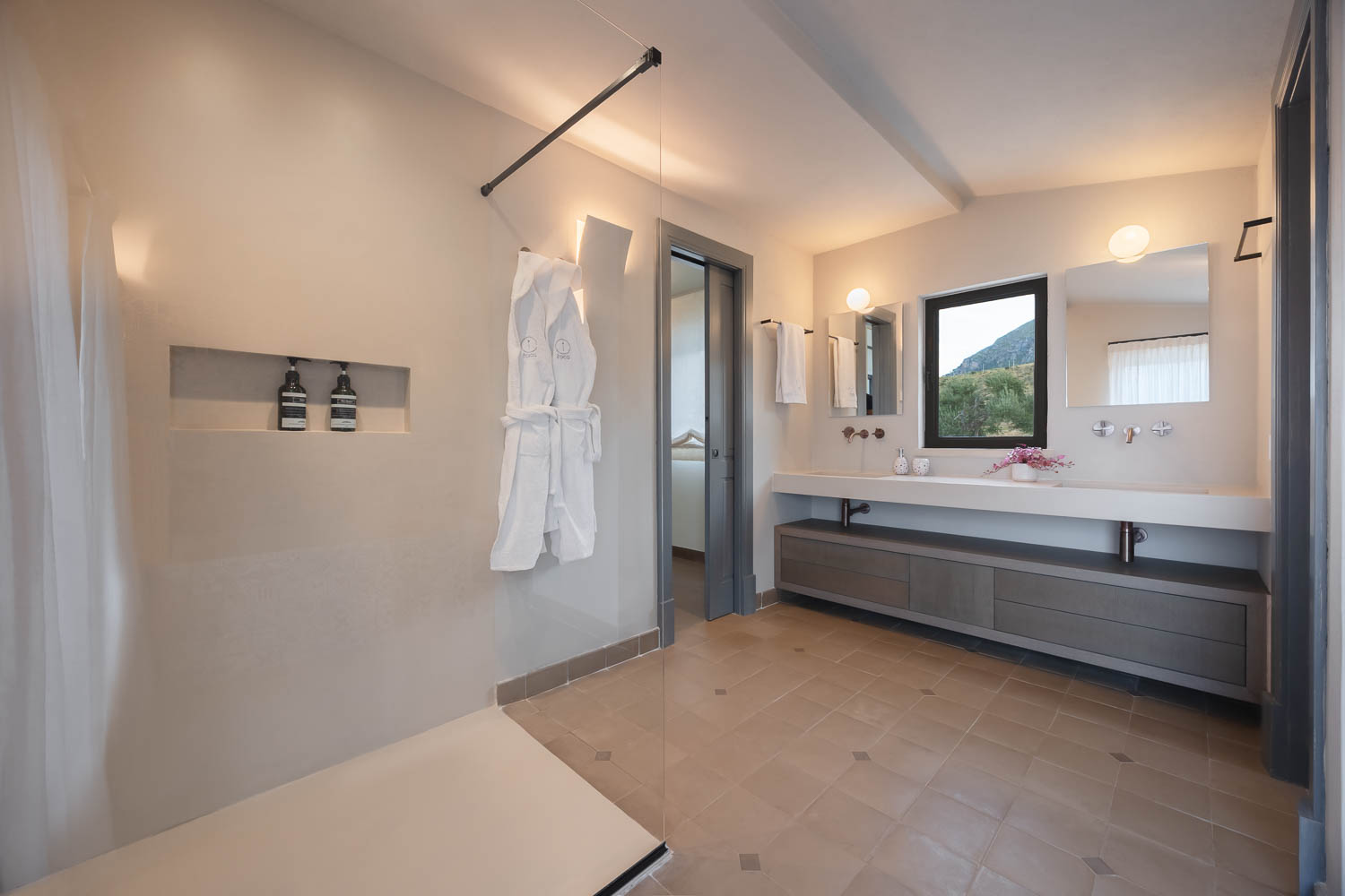 Il design degli interni dialoga con l’esterno attraverso grandi vetrate panoramiche e porticati ombreggiati, mentre la cucina, ampia e accogliente, è dotata di isola centrale e forno a legna tradizionale per momenti di convivialità intimi e informali. Le camere da letto si distribuiscono tra i vari livelli garantendo privacy e indipendenza, con suite panoramiche, bagni en-suite, cabina armadio e accessi riservati che rendono la villa adatta anche a soggiorni più lunghi e riservati.